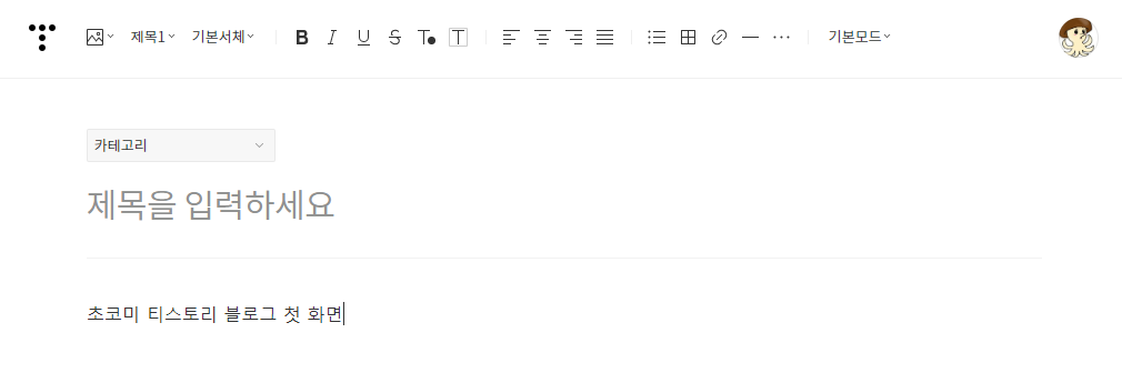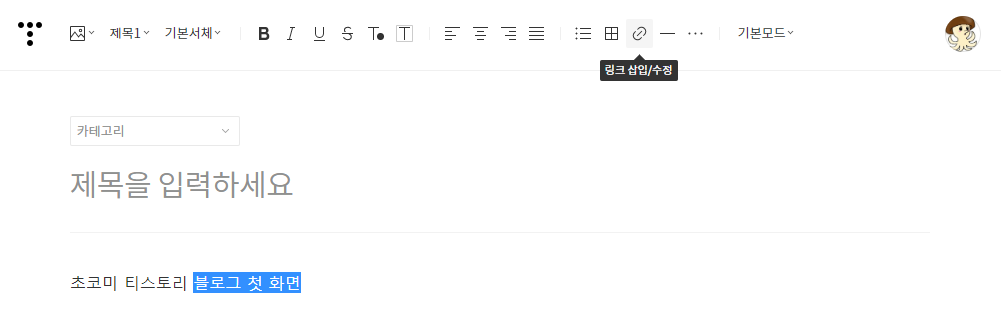 나는 모든 글자에 링크를 걸지 않고, "블로그 첫 화면"이라는 글자에만 링크를 걸기 위해 드래그 하였다.