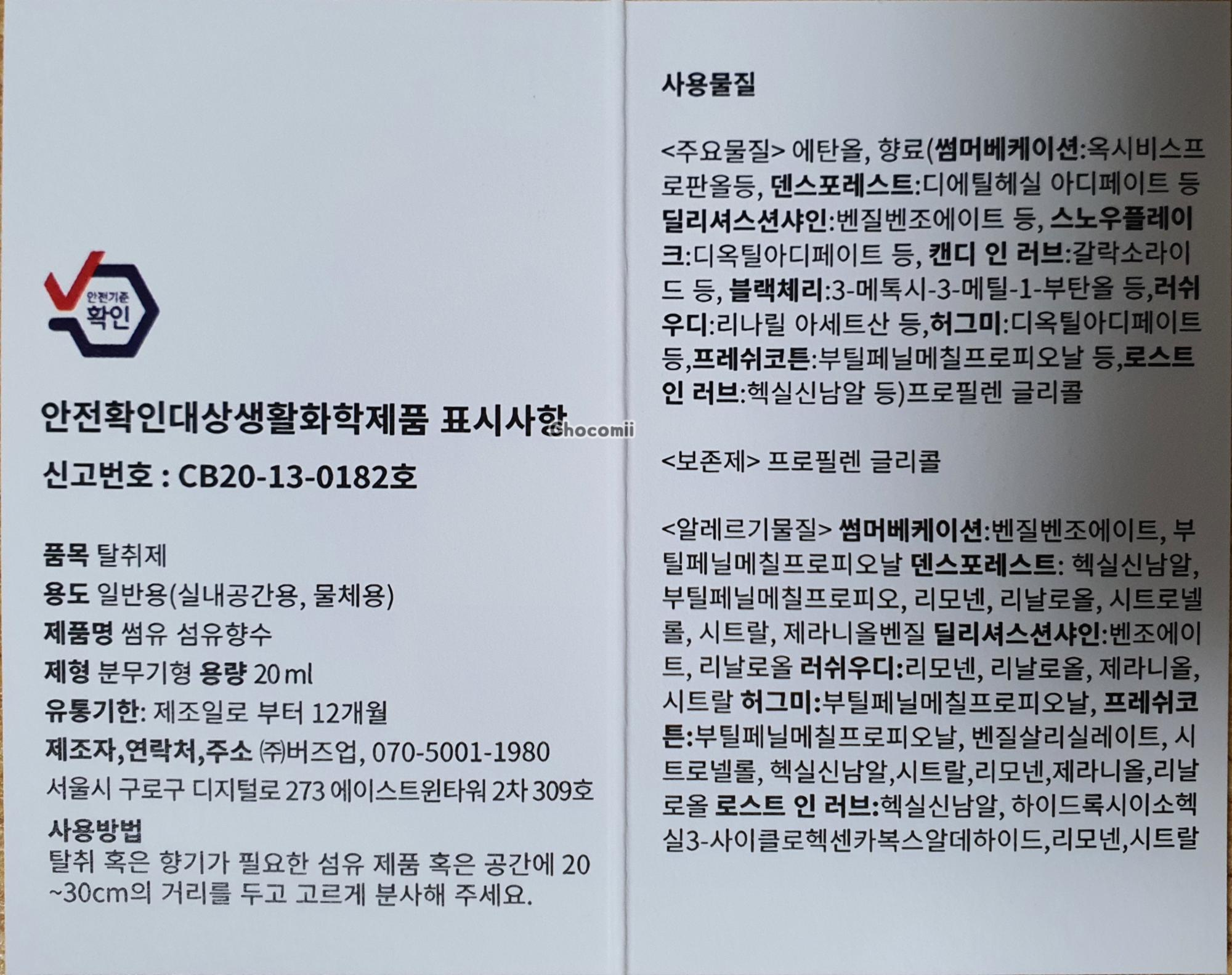 <주요물질> 에탄올, 향료(썸머베케이션 :옥시비스프로판올등, 덴스포레스트:디에틸헤실 아디페이트 등, 딜리셔스션샤인:벤질벤조에이트 등, 스노우플레이 크:디옥틸아디페이트 등, 캔디 인 러브 갈락소라이 드 등, 블랙체리:3-메톡시-3-메틸-1-부탄올 등,러쉬우디 리나릴 아세트산 등, 허그미:디옥틸아디페이트 등, 프레쉬코튼:부틸페닐메칠프로피오날 등, 로스트 인 러브 헥실신남알 등)프로필렌 글리콜