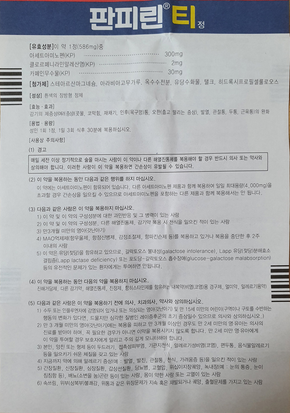 이 약에는 아세트아미노펜이 함유되어 있습니다. 다른 아세트아미노펜 제품과 함께 복용하여 일일 최대용량(4,000mg)을 초과할 경우 간손상을 일으킬 수 있으므로 아세트아미노펜을 포함하는 다른 제품과 함께 복용해서는 안 됩니다.
