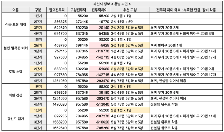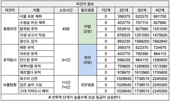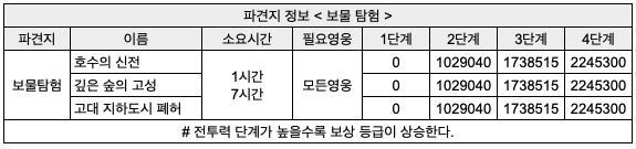 - 파견지 3곳 모두 보상과 전투력 기준이 동일합니다.