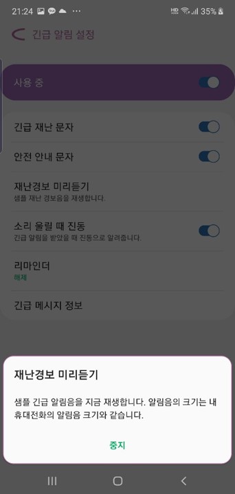 재난 경보 미리듣기를 이용해 재난 경보를 미리 들어볼 수 있다.