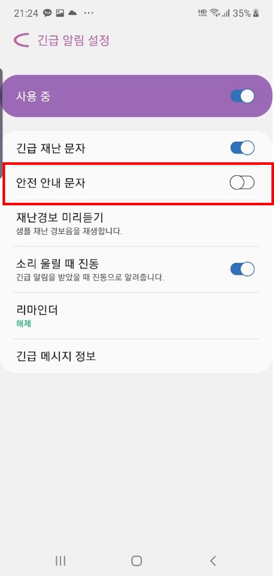 위에 표시한 것 처럼, 안전안내문자만 사용을 해제할 수 있고, 긴급재난문자만 사용을 해제할 수도 있다.
