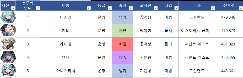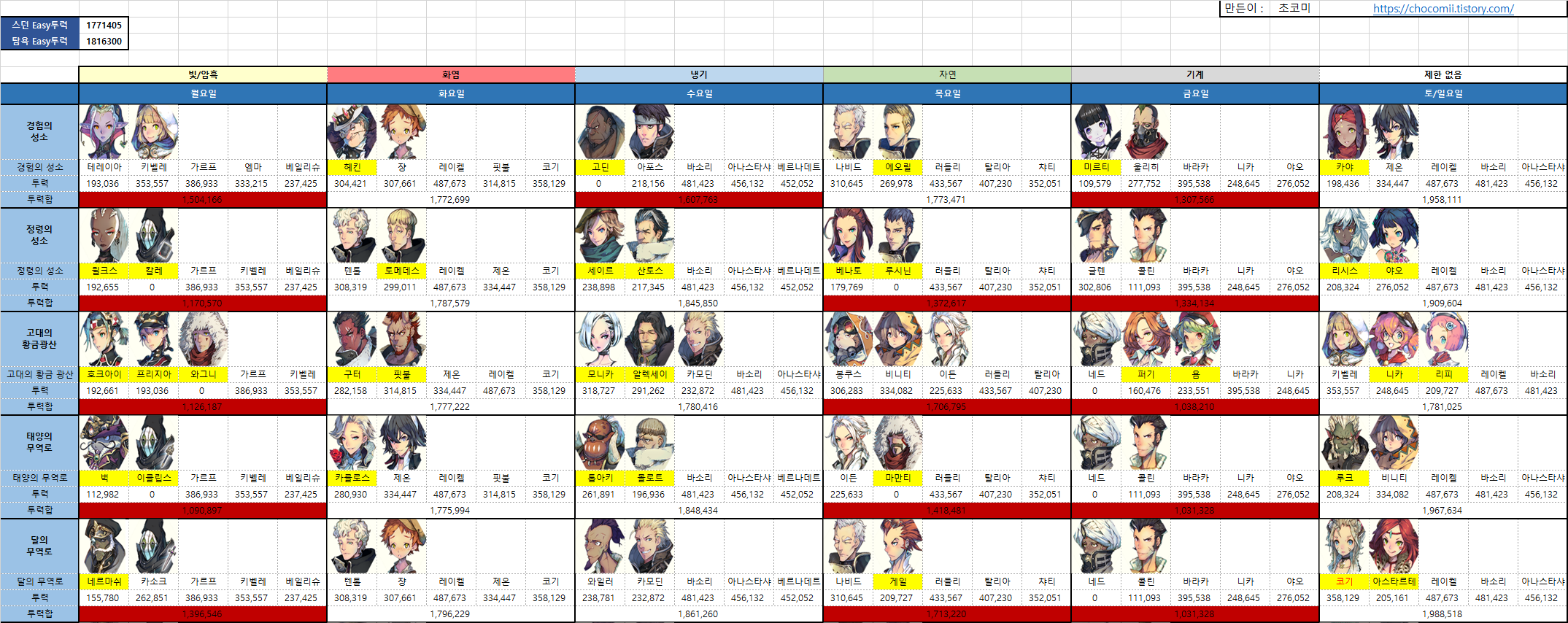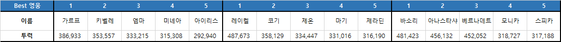 스페셜던전Sheet 하단에 아래와 같이 각 속성별 Best 5영웅을 넣어두었으니 참고하실 수 있습니다