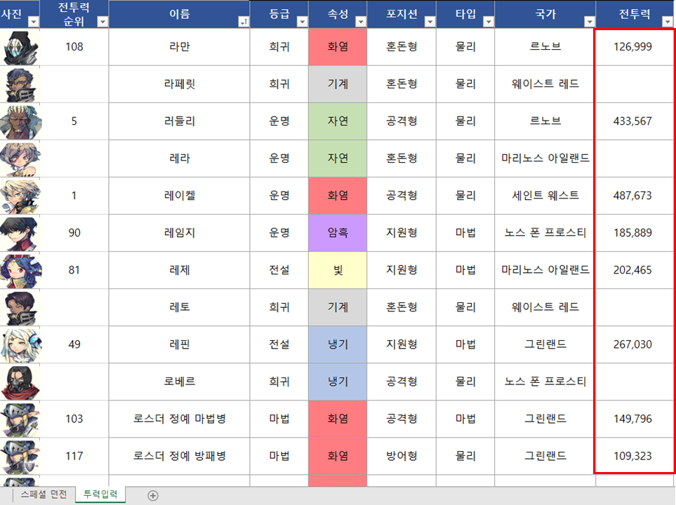 입력해야 하는건 투력입력Sheet에 각자 영웅의 투력을 입력해주는 겁니다.