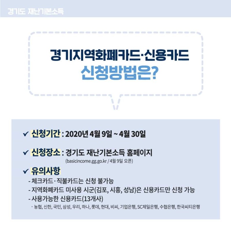 체크카드나 직불카드는 신청이 불가능하며 지역화폐카드를 사용하지 않는 김포나 시흥, 성남은 신용카드만 신청가능하다. 사용가능한 신용카드는 위 이미지 참고.