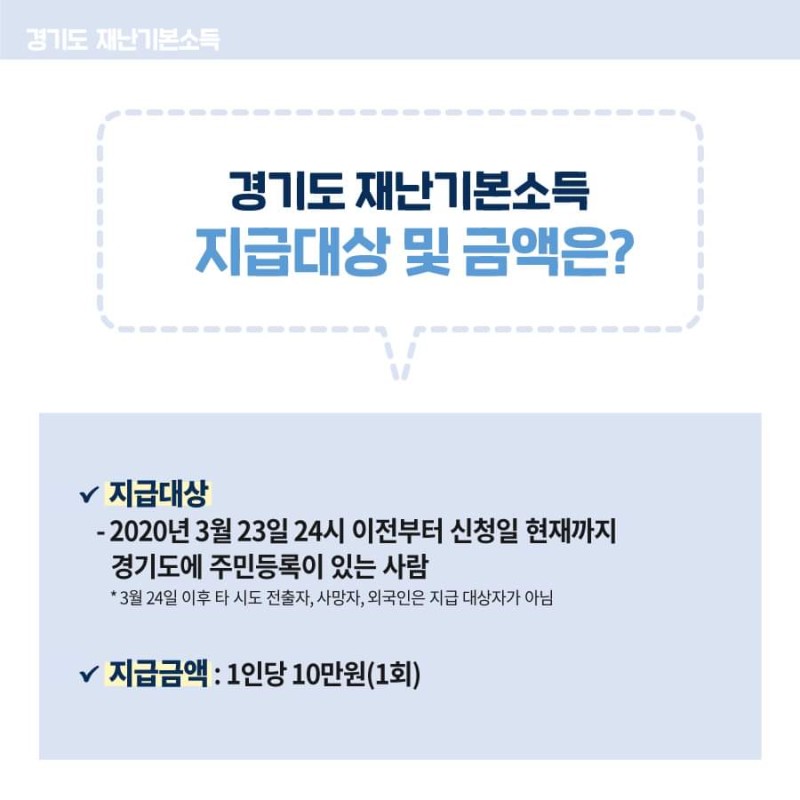 1인당 10만원으로 3월 23일 24시 이전부터 신청일까지 경기도에 주민등록이 있는 사람이 대상이다.