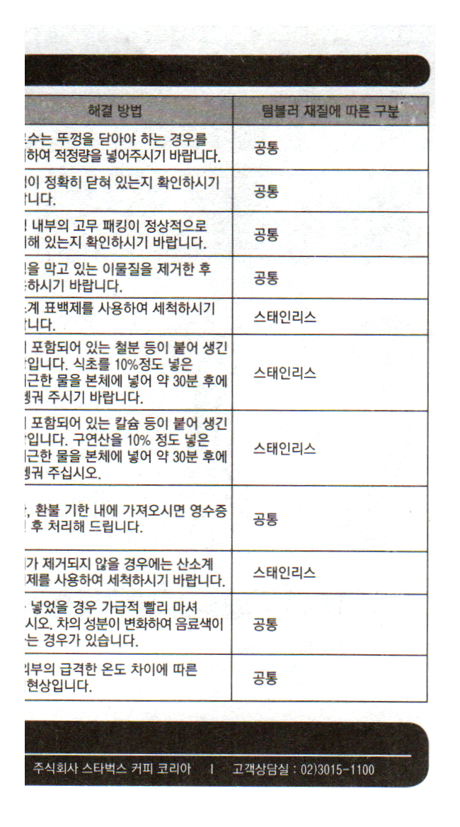 | 텀블러 외벽, 내벽 사이의 진공 상태에 문제가 생겼다. | 교환, 환불 기한 내에 가져오시면 영수증 확인 후 처리해 드립니다. |