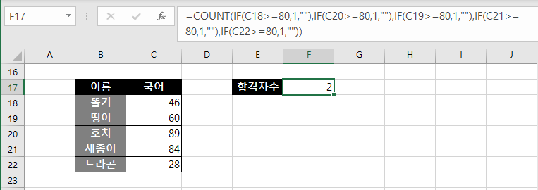 위와같이 5명의 학생 중 국어점수를 80점 이상 받으면 합격을 한다. 합격한 총 인원 수를 구해보자.