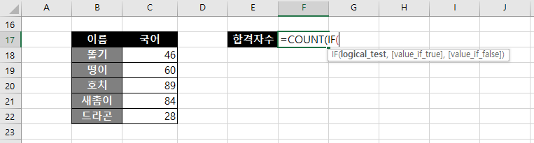 첫번째줄에서 설명했듯이 Count함수는 포함한 인수중에서 숫자의 갯수도 구해준다. 이것을 이용해 IF함수로 합격자 수를 구해보자.