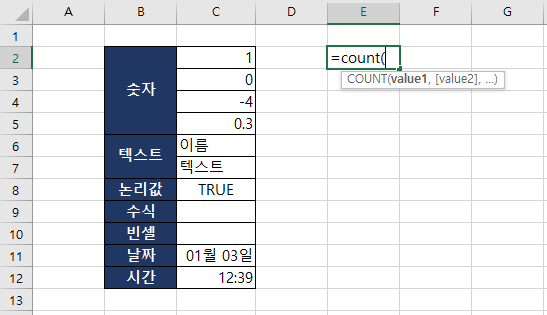 즉, COUNT함수에 숫자인 인수가 두개이므로 값은 2가 반환된다.