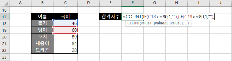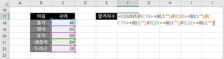 하지만 이 경우 각각의 아이들의 점수가 조건을 만족하는지 IF함수로 일일이 작성해줘야 하기 때문에 번거롭고 복잡하다. 이걸 간단하게 할 수 있는 COUNTIF함수가 있으니 방금 설명한 이 방법은 참고만 하도록 하자.