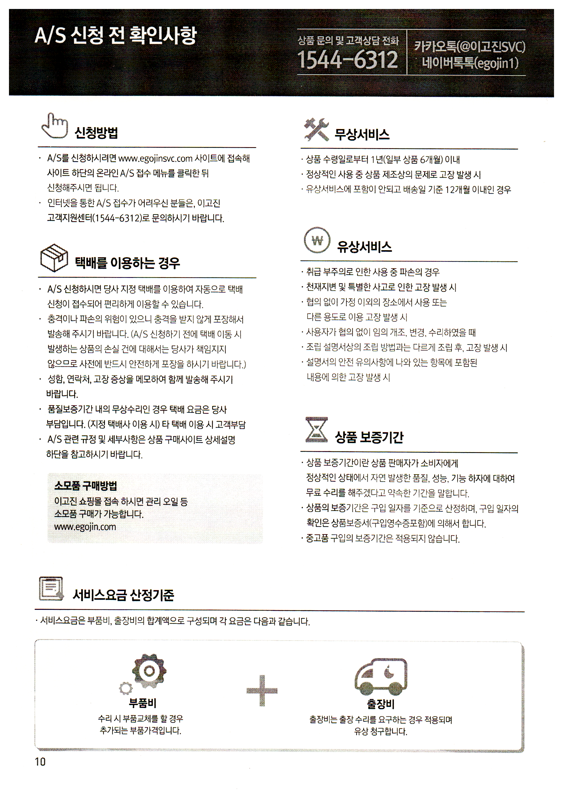 · A/S를 신청하시려면 www.egojinsvc.com 사이트에 접속해 사이트 하단의 온라인 A/S 접수 메뉴를 클릭한 뒤 신청해주시면 됩니다.