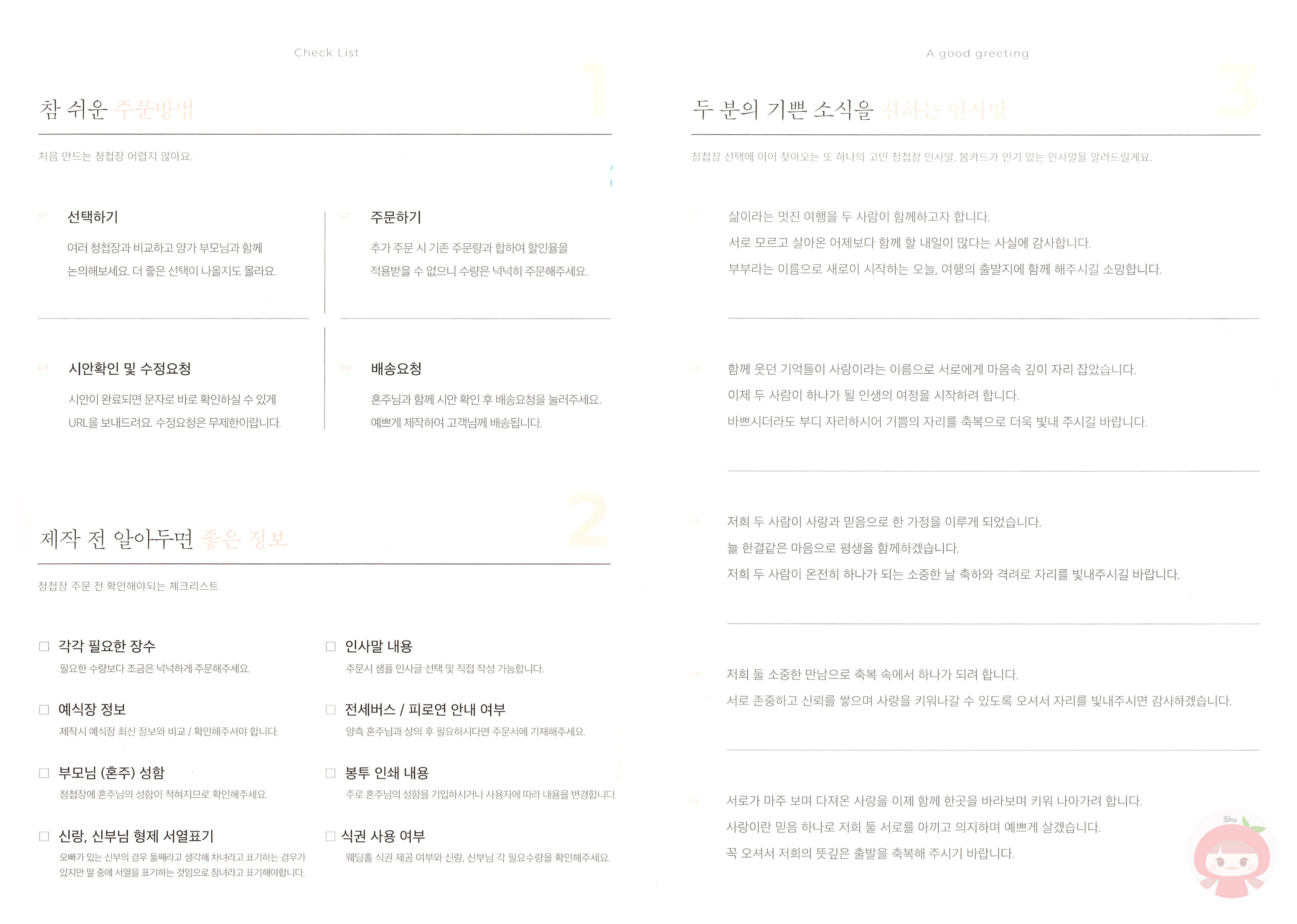 주문 방법과 청첩장 제작 전에 알아두어야 할 정보도 잘 정리해서 보내주셨다.