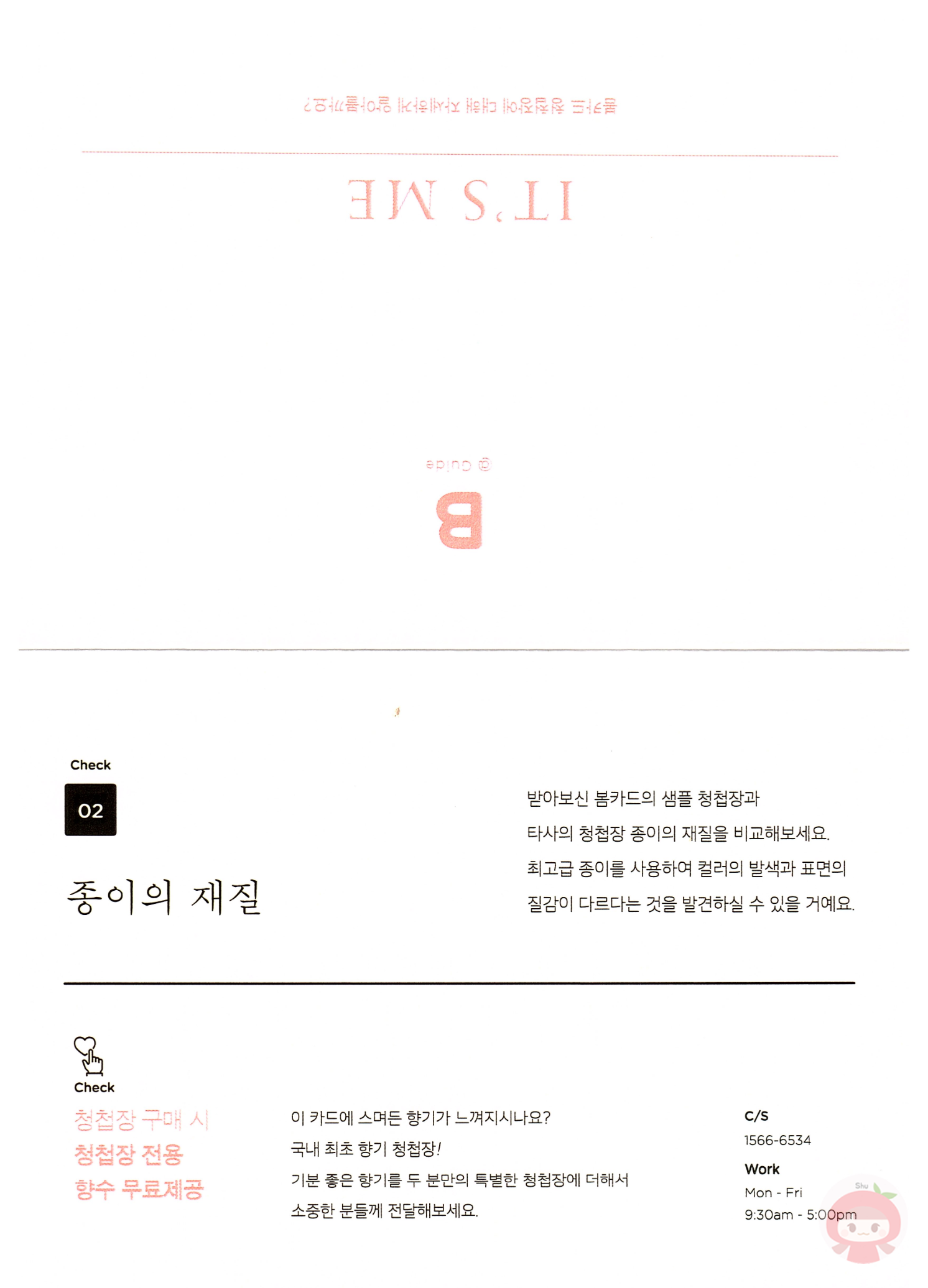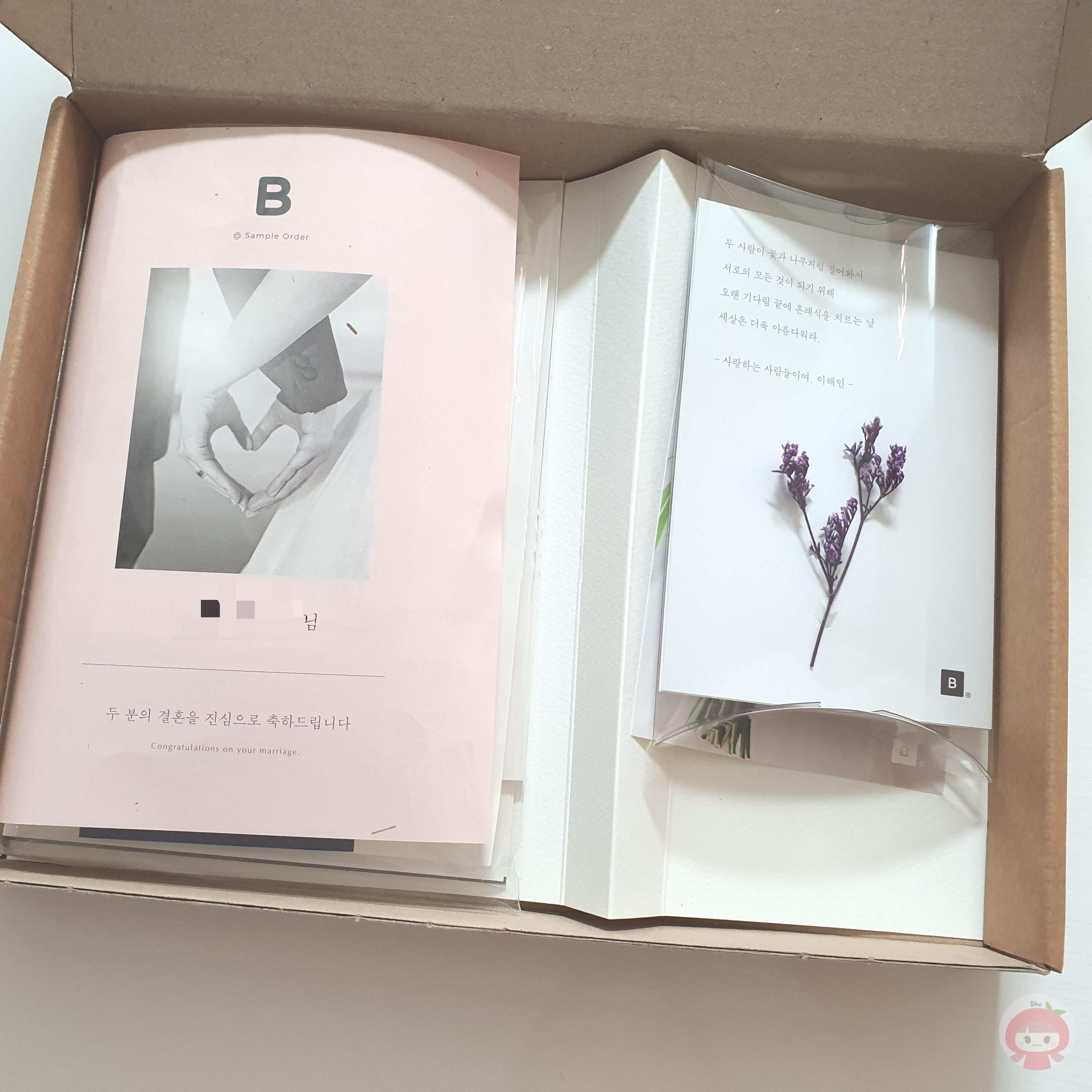 플래너에게 문의시 제휴 업체가 따로 있었는데, 봄카드의 청첩장도 예쁘고, 구성도 너무 마음에 들어서 가격차이가 좀 있더라도 봄카드가 마음에 들면 봄카드에서 구매하자는 생각으로 샘플 주문.